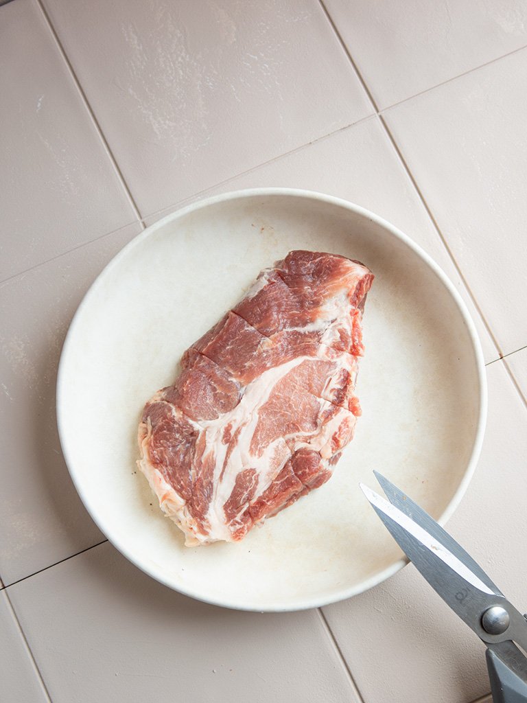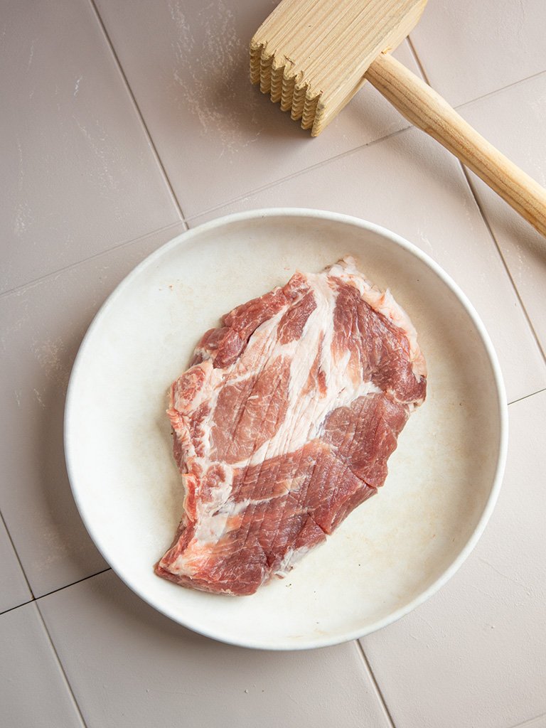 1. Elige una chuleta de aguja gruesa, de 1,5 a 2 cms de grosor, para garantizar un tonkatsu jugoso. Haz pequeños cortes en los bordes para que no se arquee durante la fritura y golpéala suavemente para ablandar las fibras.